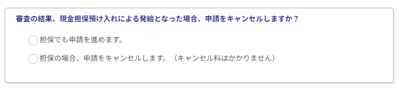 オンライン申請の最終確認ページに「担保でも申請を進める」か、「担保の場合、申請をキャンセルする」かを選択していただく項目があります。