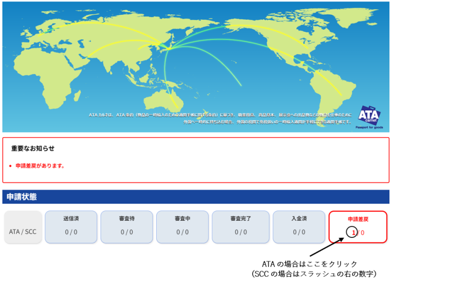 差し戻された申請は、①電子申請システムのTOP画面の[申請差戻]の数字をクリック(下図参照)→②[カルネ一覧]画面の[詳細]ボタンをクリック→③[カルネ詳細]画面一番下にある[差し戻された申請を編集]ボタンをクリックすることで編集できます。