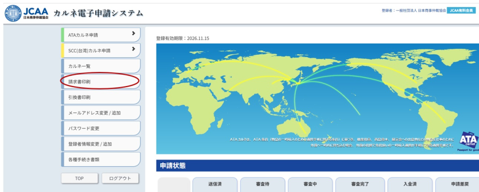 また、審査完了後は、オンライン電子申請システムのトップページ左側メニュー「請求書印刷」(下記画像参照)より、「発給料金」および「振込先」等が記載された請求書を印刷することが可能になります。