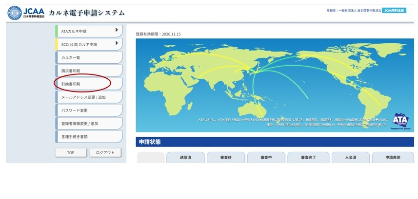 発給料金のご入金が確認できましたら、オンライン電子申請システムのトップページ左側メニュー「引換書の印刷」(画像参照)から「引換書」を印刷いただけるようになります。予め必要事項をご記入のうえ窓口までお越しください。